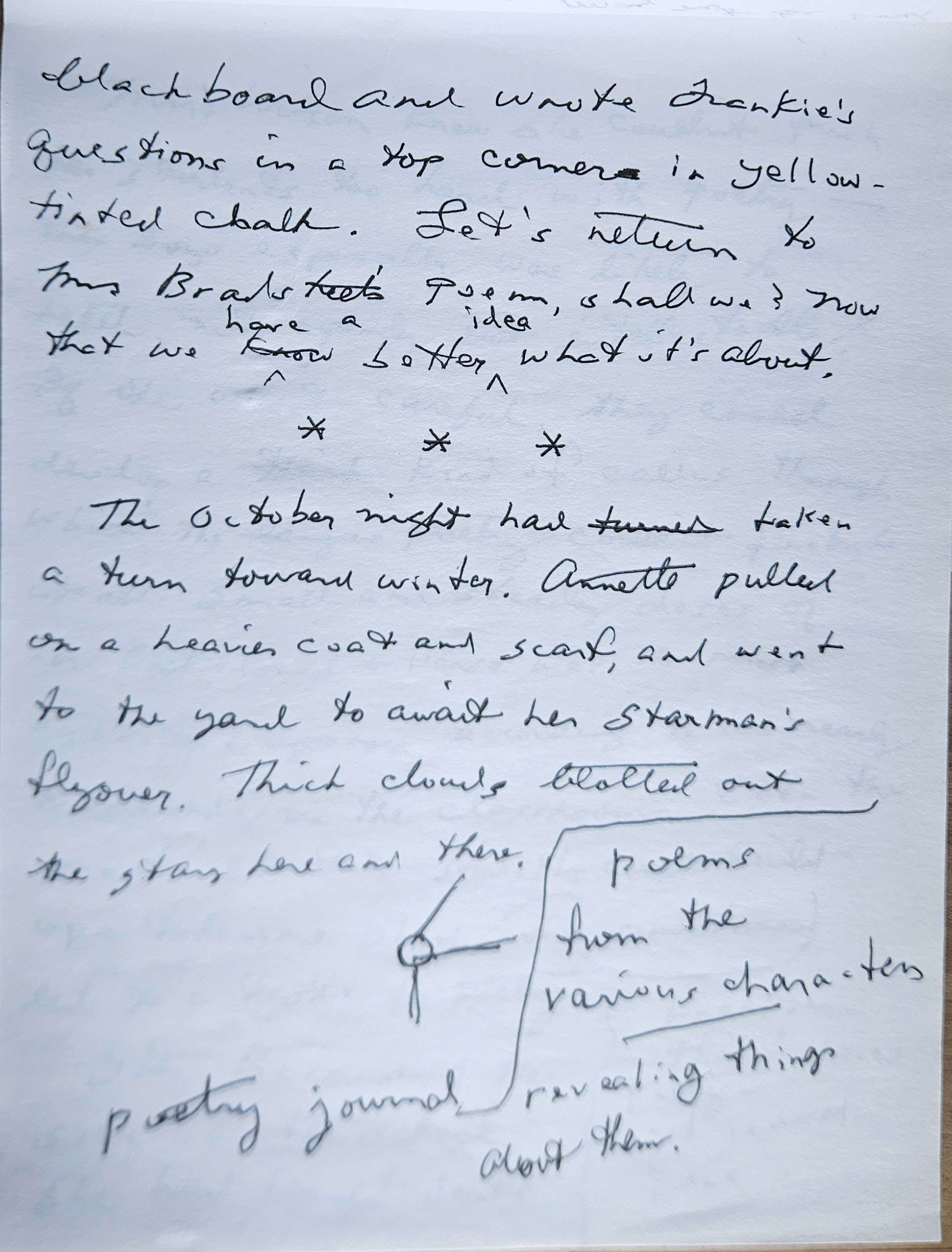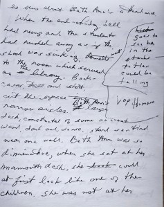 Annette composed poems and little stories when she was a child, but by the ti her teen years she’d gotten out of the habit. The War effort was all-consuming—collecting scrap metal, writing letters to the wounded trips [troops], co consoling the mothers whose sons were away being soldiers. There was no room for soppy verse. Over the years she had thoughts about [?] poems she could write, but something always prevented her from touching pen to paper and getting the words down in ink. Something inside of her that she never bothered to name. It was like fear, but not fear of inadequacy, fear that her words were not good enough—fe more like fear of exposing some interior part of herself <psyche>, a piece she kept hidden even from herself.