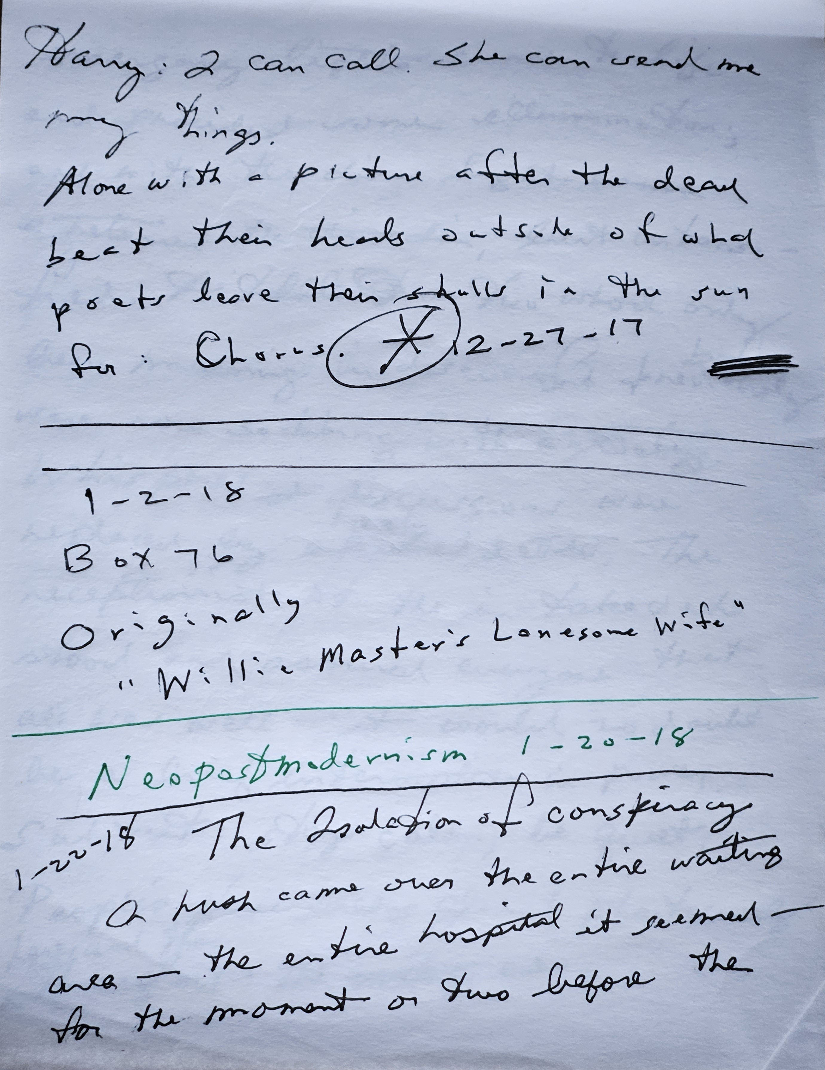 [The story was continued in the tablet identified as “‘Vox Humana’ cont’d / 12-15-17 / The Isolation of Conspiracy cont’d / 1-22-18”; and its conclusion was marked with an asterisk-circle on 12-27-17. Note: “The Isolation of Conspiracy” was the working title of what became the novel The Artist Spoke (2021); also, the reference to “Box 76” dated January 2, 2018, is a reference to the William H. Gass Papers at Washington University in St. Louis — I must have been planning a trip there to do research for a paper (which I was scheduled to present at the Louisville Conference on Literature and Culture in February).]