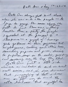 [Many pages of writing followed this section, exploring a lot of different ideas about the story, including bringing in some of her students as significant characters, especially Frankie. I also considered various experimental techniques, including somehow structuring the story like a satellite [there’s a conceptual sketch]. Meanwhile I was searching through stories from Crowsong for the Stricken for ideas and inspiration, especially “The Curvatures of Hurt.” There are no dates throughout this section, which means I wasn’t typing up the pages because I knew the story didn’t yet have its footing. It’s worth noting that much of this material became fodder and inspiration for the story that immediately followed, known at first as “Beth Ann story,” which I began October 2018 and completed January 2019. It was published as “The Cold Dark March to Winter.”]