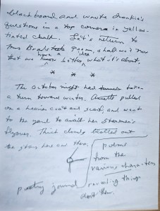 The story that would become “Vox Humana” spans four Mead writing tablets, beginning with one marked as “Mrs Saville / mid Letter 9 / 6-13-17 / Beginning of Star-man / 9-28-17.” When I started using this particular tablet, I was working on Mrs Saville, an epistolary novel, and I was in the middle of “Letter 9,” as of June 13, 2017. Some three and a half months later, I began work on what would become “Vox Humana” (on September 28, 2017). I first thought of the piece as “Star-man.” I always pick a title that seems appropriate, knowing, though, that I will change it before finishing whatever it is.