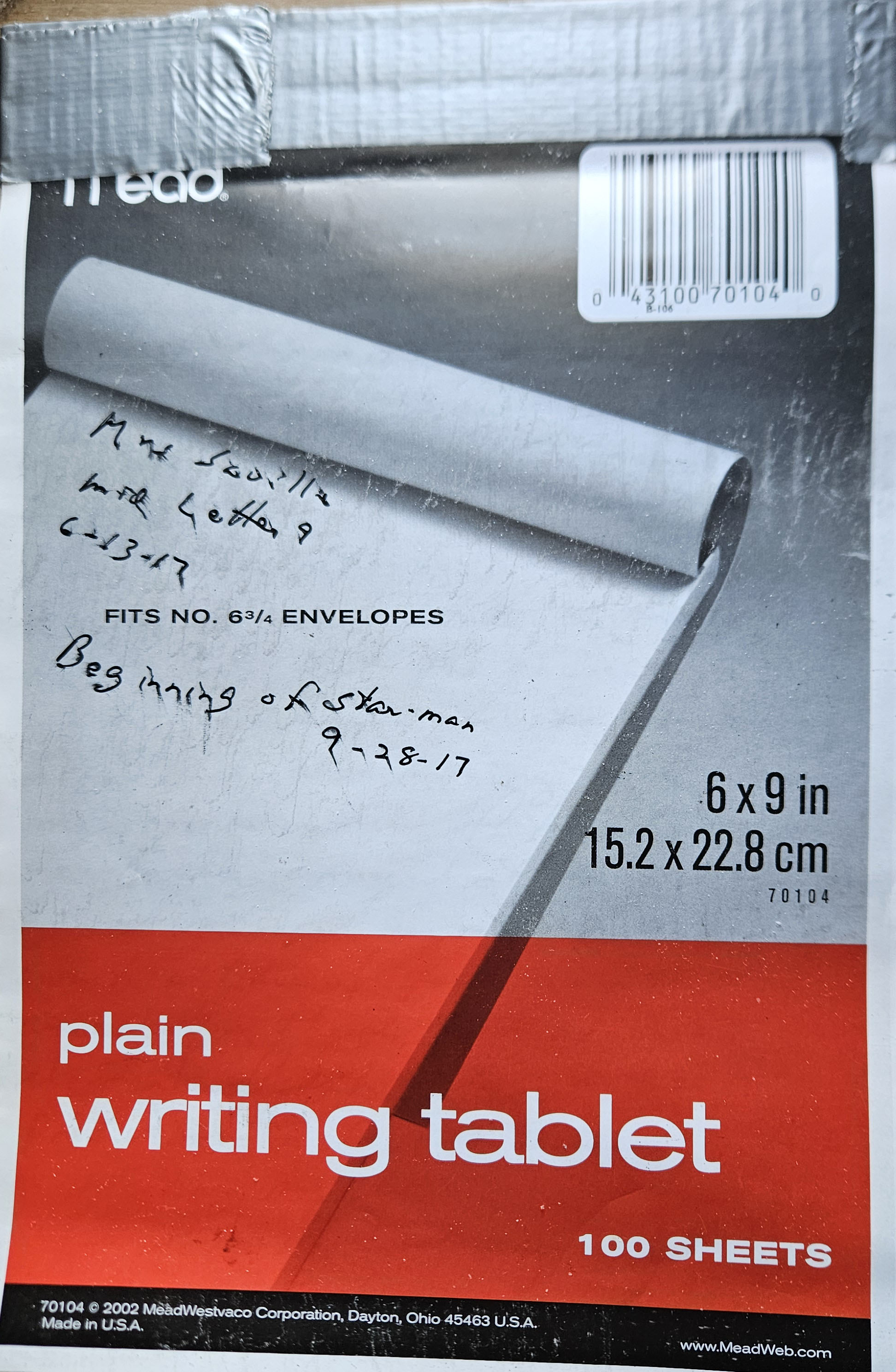 (In the photo, you’ll note the strips of duct tape binding the top of the tablet. Mead used to make their tablets of sturdier stuff, but at some point they became flimsier, so flimsy that pages would easily become detached. I began wrapping the tops of the tablets in duct tape to fix this issue. It became a kind of ritual: readying a fresh tablet for whatever creative adventure it may facilitate by securing its unblemished pages in strips of gray duct tape.)