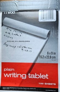 Many years ago I began writing my creative work — mainly fiction — longhand, as opposed to writing via typewriter (when I began) or word-processor (later) or computer. At some point, while working on what would become my first published novel (Men of Winter, 2010 — but finished much earlier than that), I began writing exclusively in Mead 6 x 9-inch tablets. I like the size. It is easy to handle and manipulate while writing in the chair I always sit in. More important is the fact the small, handwritten page looks nothing like the page when it’s typed and printed. I find that when I compose on a computer screen (as I’m doing this very moment) I’m aware of how sentences and paragraphs look, which then influences how I’m putting the words on the screen (or paper, back in the typewriter days).